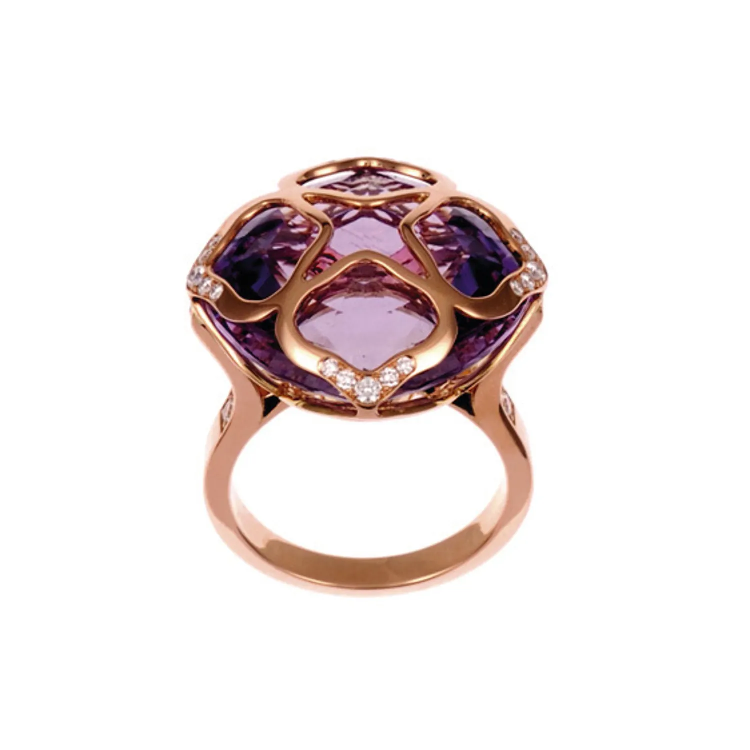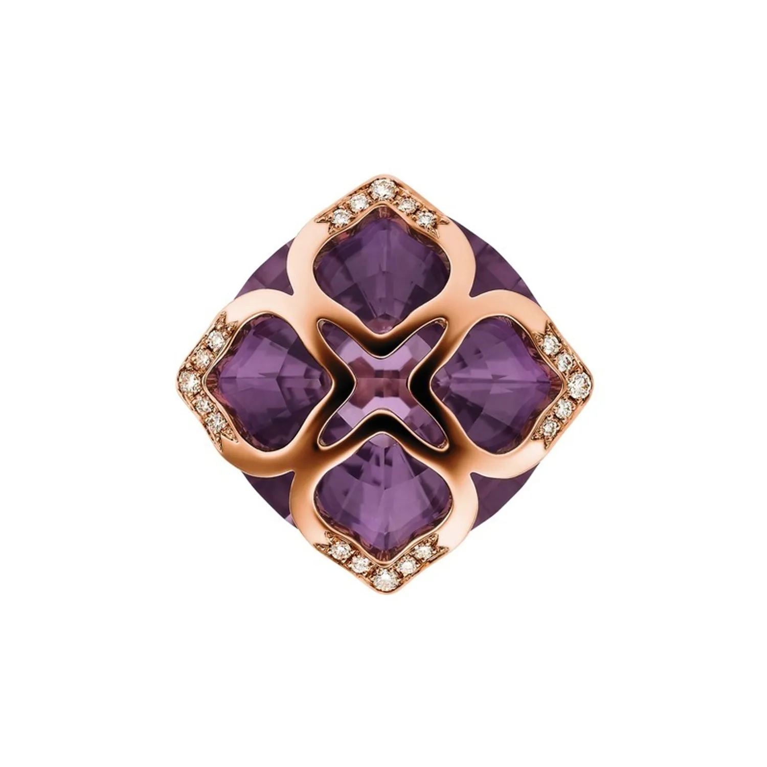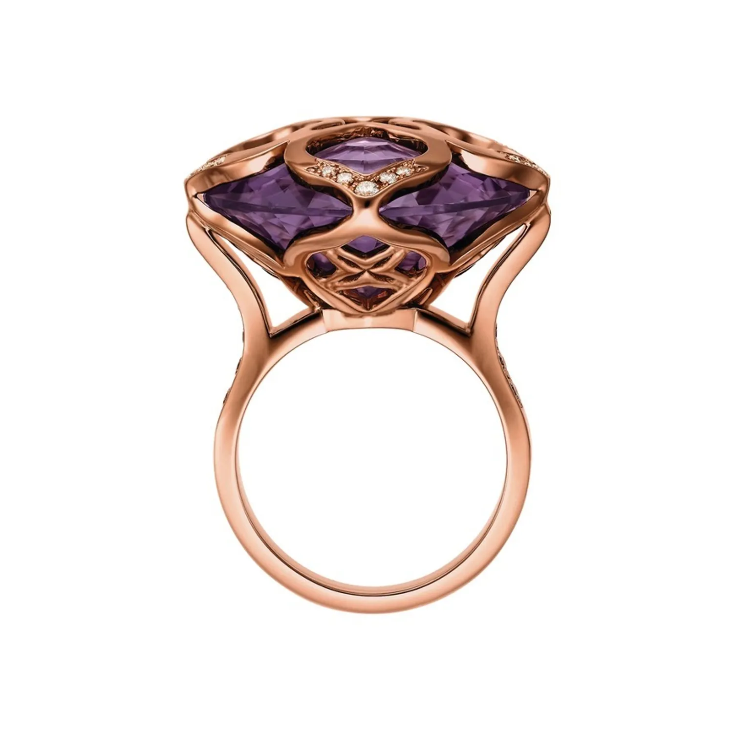 Delicate curves and generous proportions give this IMPERIALE cocktail ring in 18-carat rose gold a majestic elegance. An opulent cushion-cut amethyst is gracefully set in an elegant diamond-set chisel, combining the softness of its curves with the refinement of its precious materials.