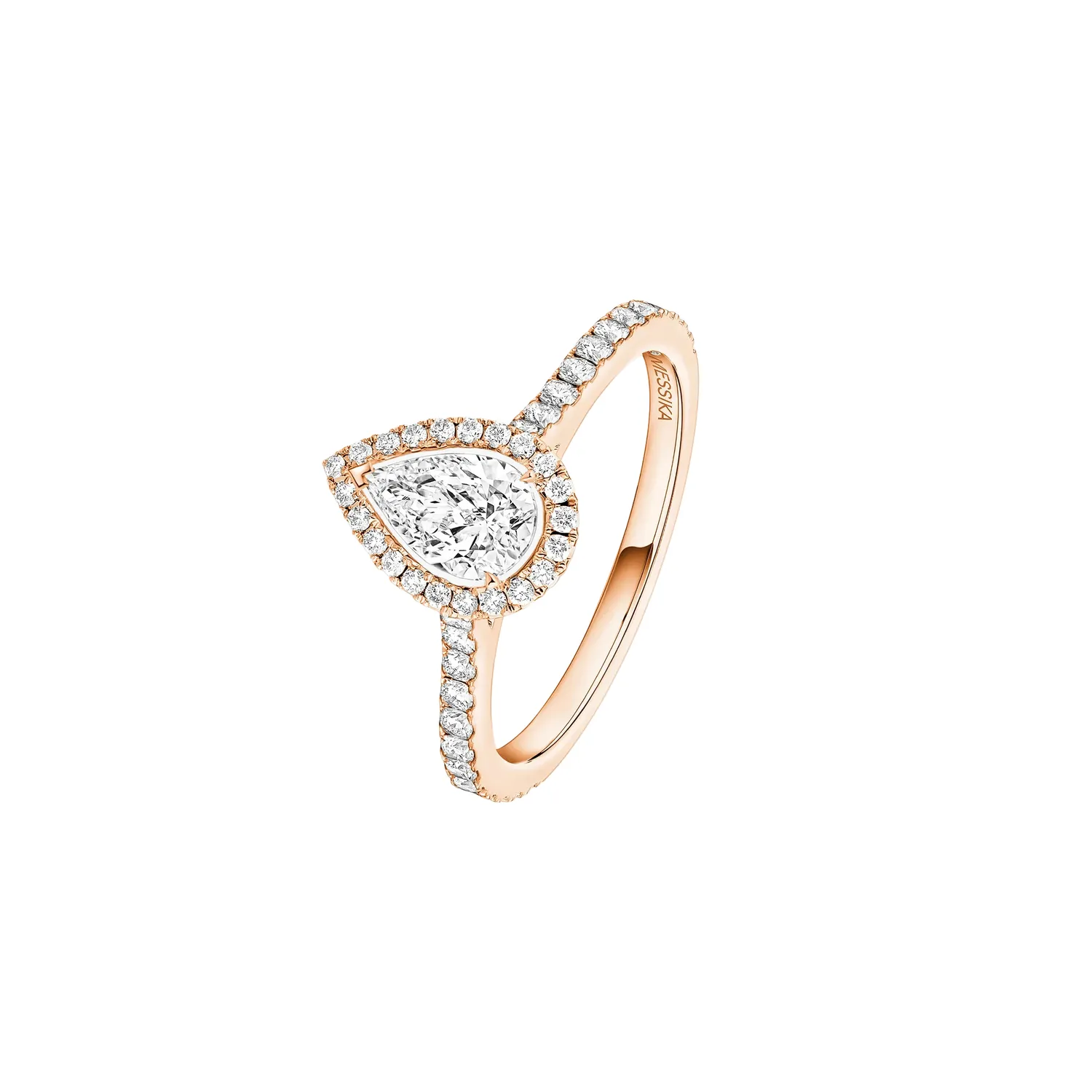 The Joy pear-cut rose gold women's ring celebrates precious moments. The pear-shaped diamond, dear to Valérie Messika, is revealed here in a sensual harmony of strength and softness. Its slender silhouette delicately elongates the hand. The signature halo, fully paved, amplifies the brilliance and presence of the center stone. Designed to be worn alone or paired with the Joy wedding band, this diamond solitaire is a fitting testament to time. Anchored in a diamond tradition of excellence, Maison Messika selects only diamonds that meet the strictest quality criteria.