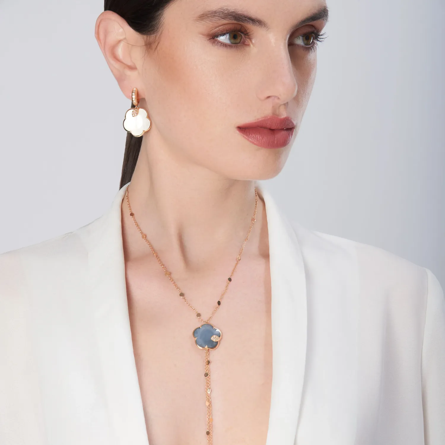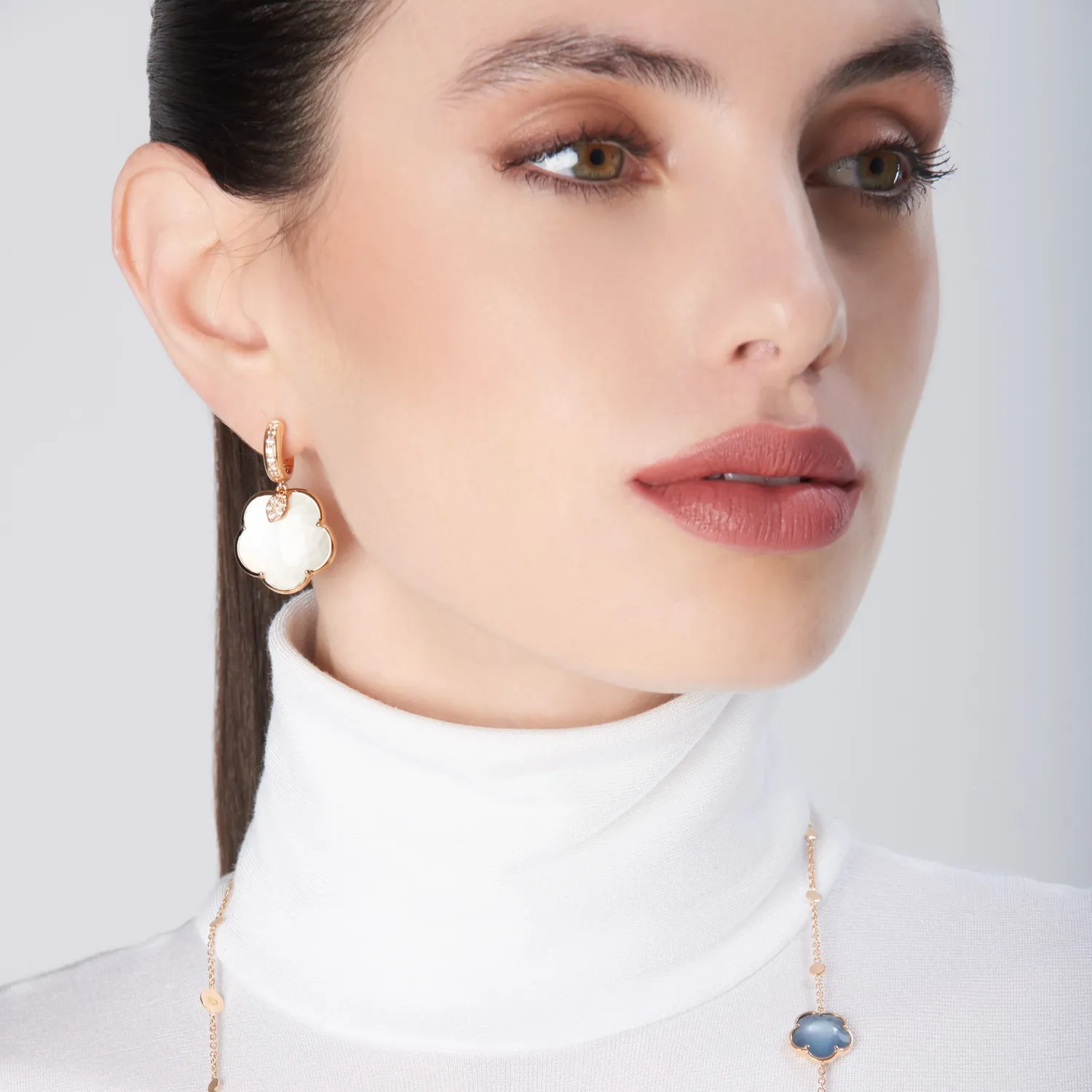Pasquale Bruni Ton Joli Lunaire earrings in 18k rose gold with Pearl of the Moon gemstone and diamonds. White diamonds: 0.19 ct, Champagne diamonds: 0.26 ct. Mother-of-pearl and white moonstone doublet, flower size 19 mm.
