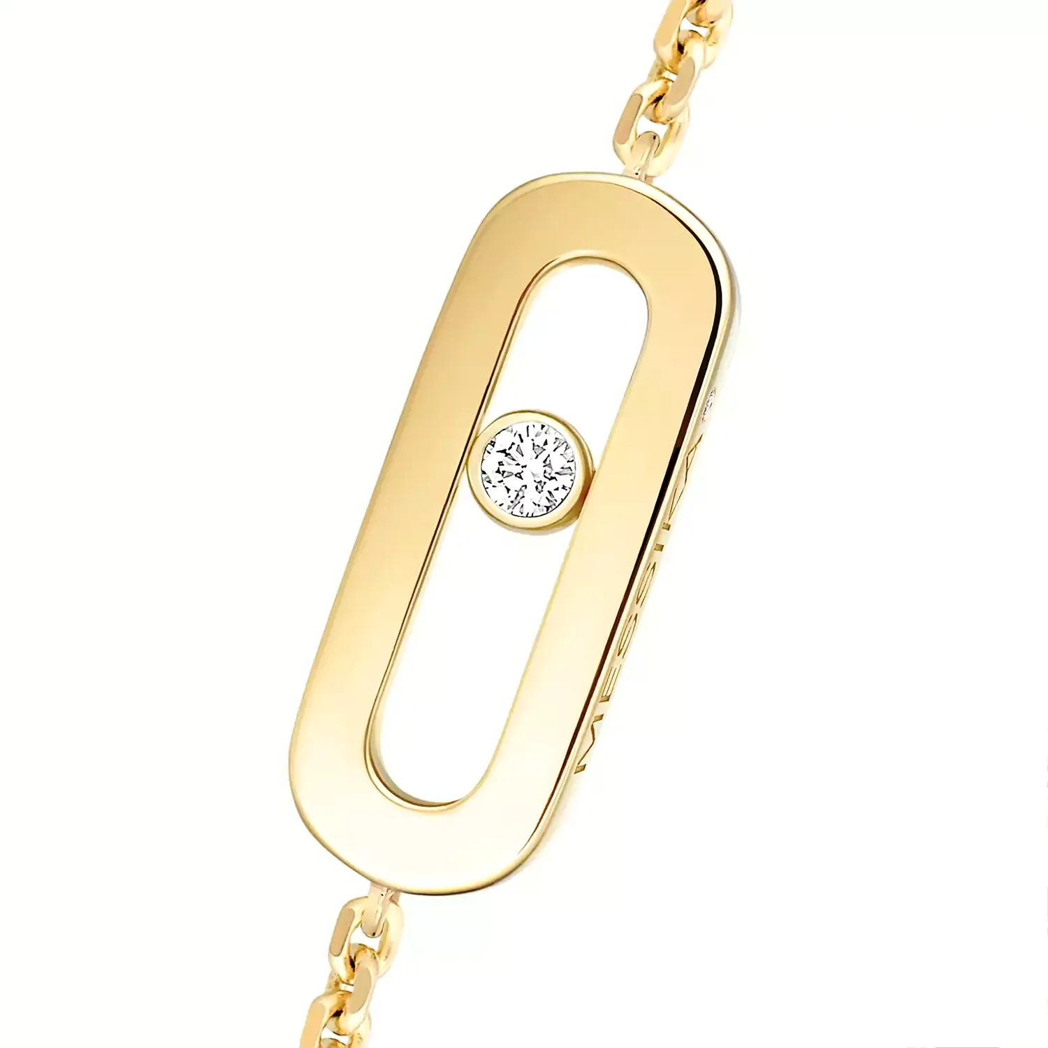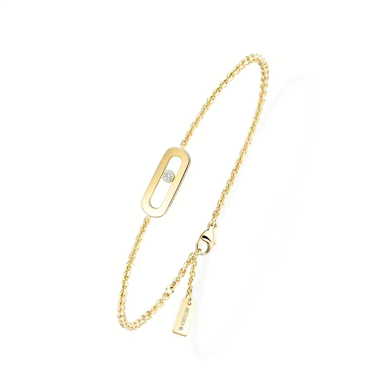 Messika Move Uno bracelet in 18-carat yellow gold, set with a 0.02-carat G/VS diamond. This bracelet is also available in white gold and rose gold. It measures 18 cm in length with 5 clasps. The bracelet motif measures 13.5 mm in length and 5 mm in width.