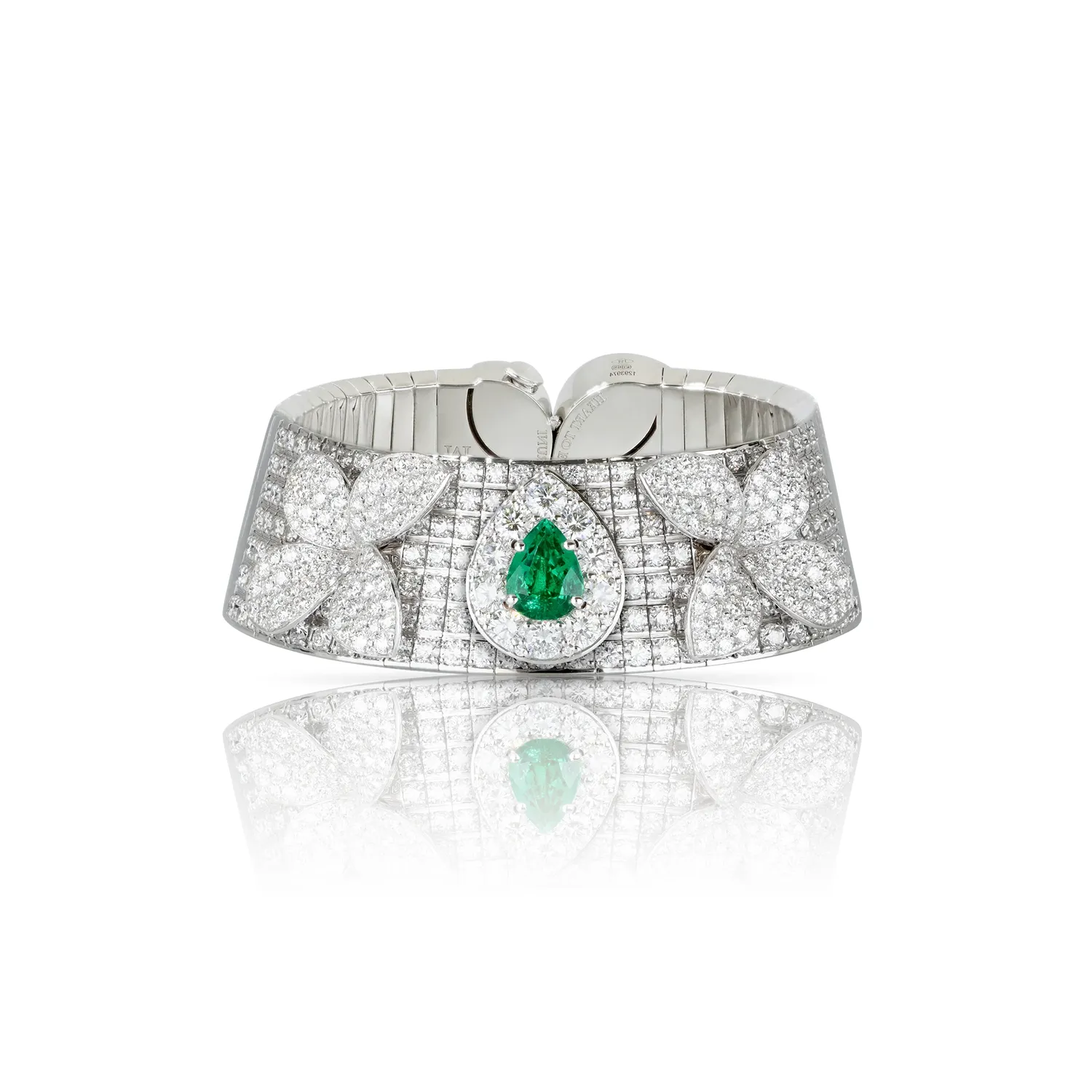 Pasquale Bruni bracelet in 18-carat white gold with a 7x9mm emerald drop and 13.80ct white diamonds. Heart to Earth collection.