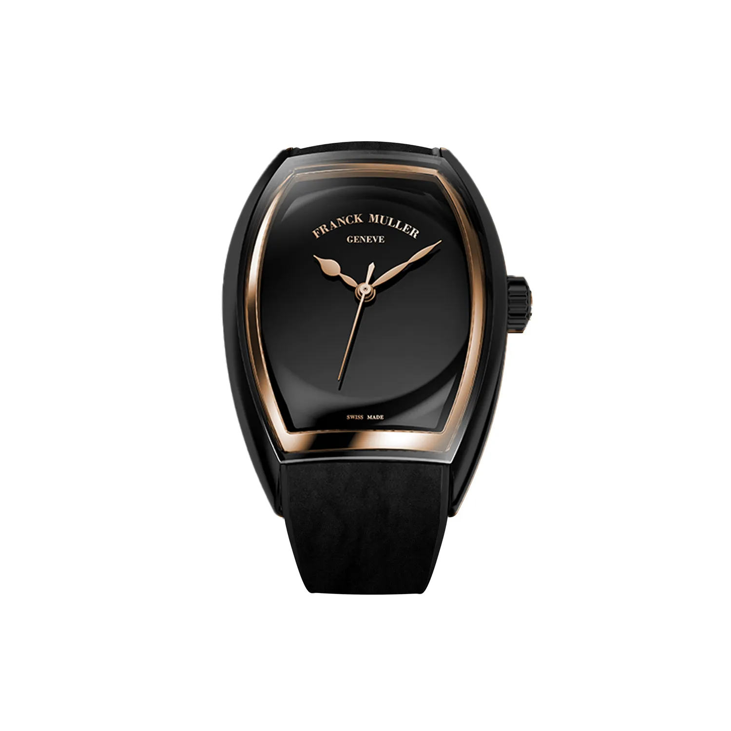 Franck Muller watch in steel (black PVD treatment) and rose gold with automatic winding movement with bidirectional rotor system, 33 x 48.4 mm. Winding shaft with 2 positions: 1. winding 2. setting the time. Hand-sewn alligator strap with hand-polished buckle. Waterproof to 30m. Curvex CX Lady Piano Collection.