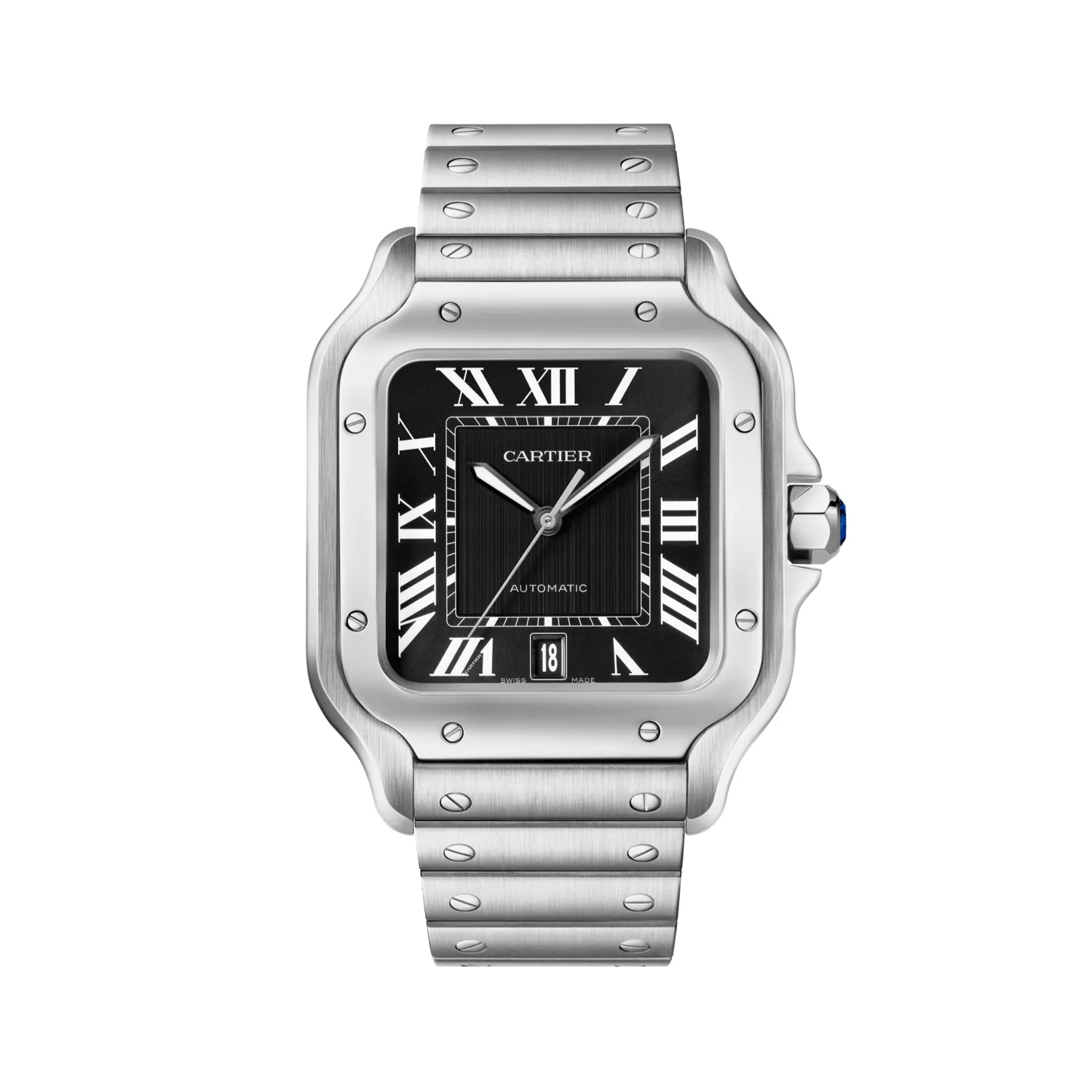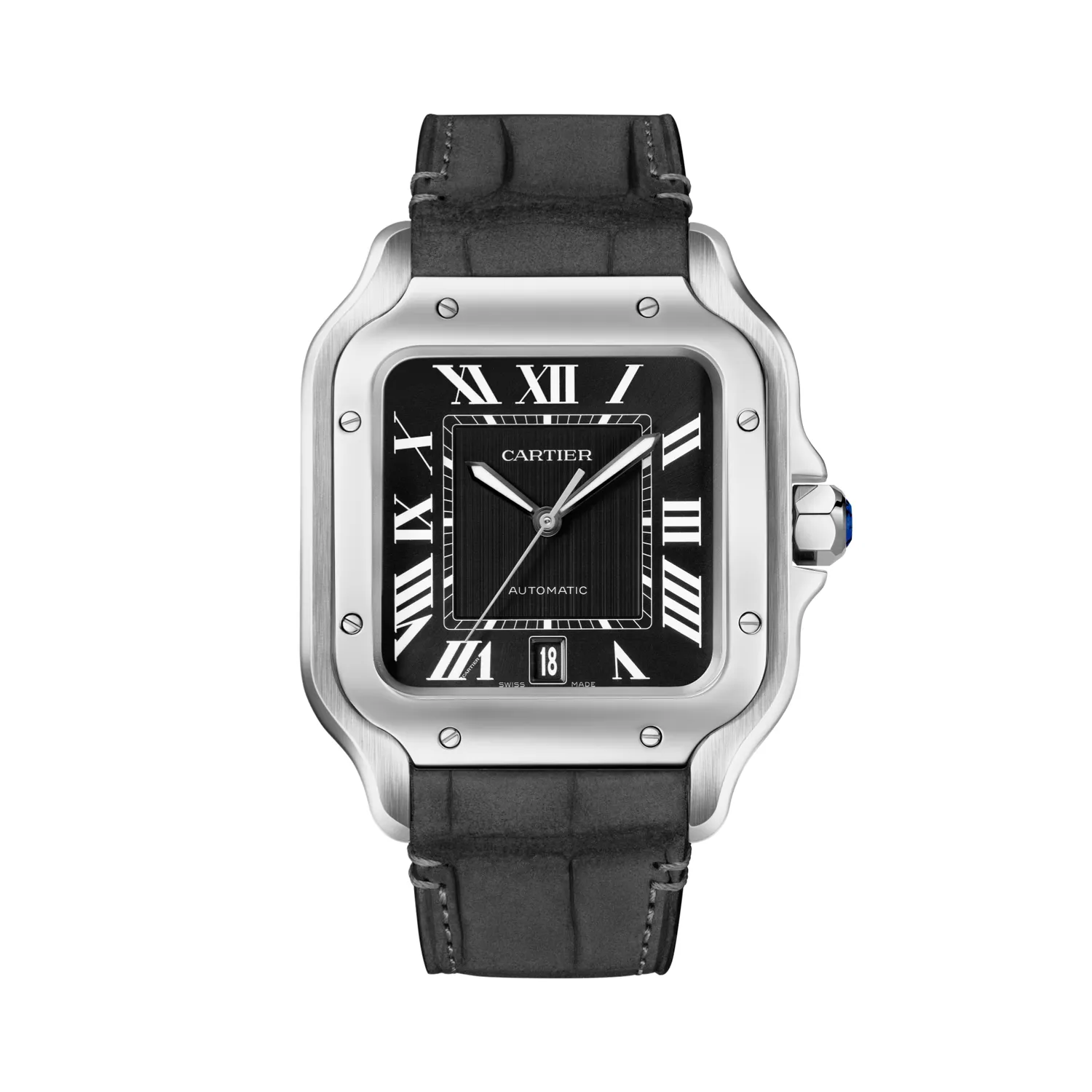 Santos watch, large model, 1847 MC self-winding mechanical movement. Steel case, 7-sided crown adorned with a faceted synthetic spinel, black dial, sword-shaped hands in black steel and luminescent material, sapphire crystal. Steel bracelet with "SmartLink" sizing system. Second strap in nubuck alligator, with interchangeable steel folding clasp. Both bracelets are equipped with the "QuickSwitch" interchangeability system. Case width: 39.8 mm, thickness: 9.38 mm. Water-resistant to 10 bar (~100 meters).