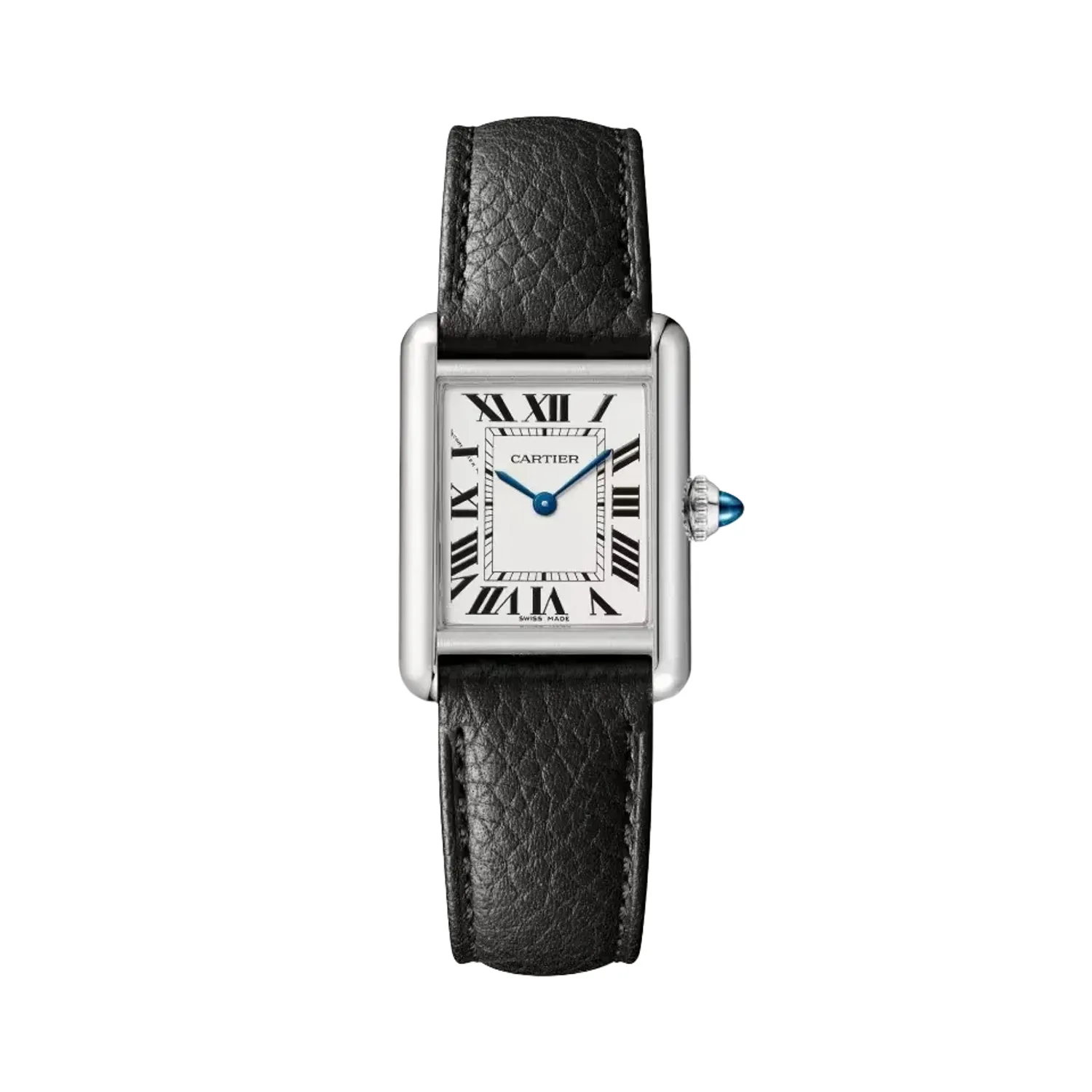 Tank Must watch, small model, High Autonomy quartz movement. Steel case, beaded crown adorned with a synthetic cabochon-shaped spinel, silver dial, blued steel sword-shaped hands, black grained calfskin strap, steel pin buckle. Case size: 29.5 x 22 mm, thickness: 6.6 mm. Water-resistant to 3 bar (~30 meters).