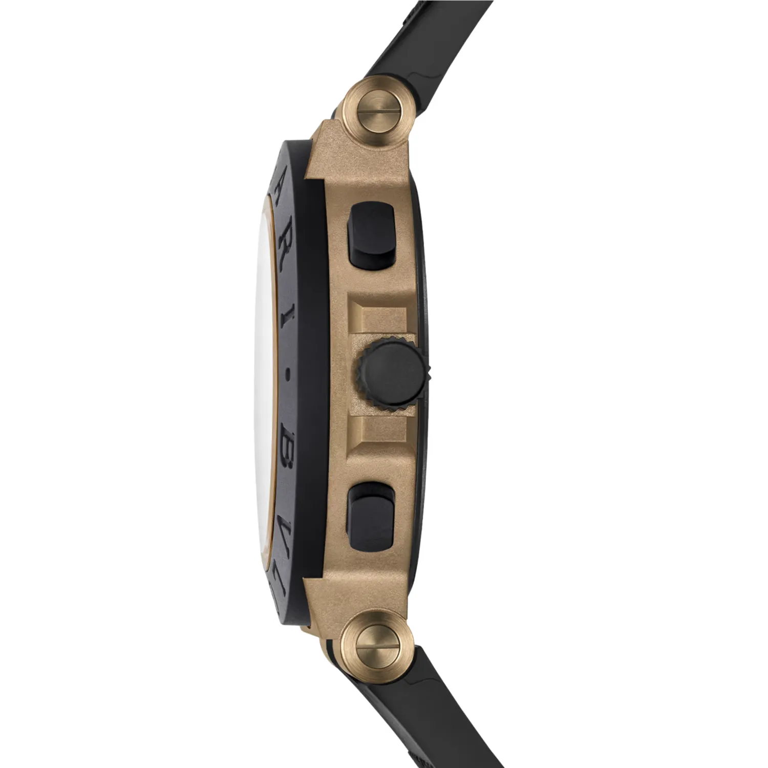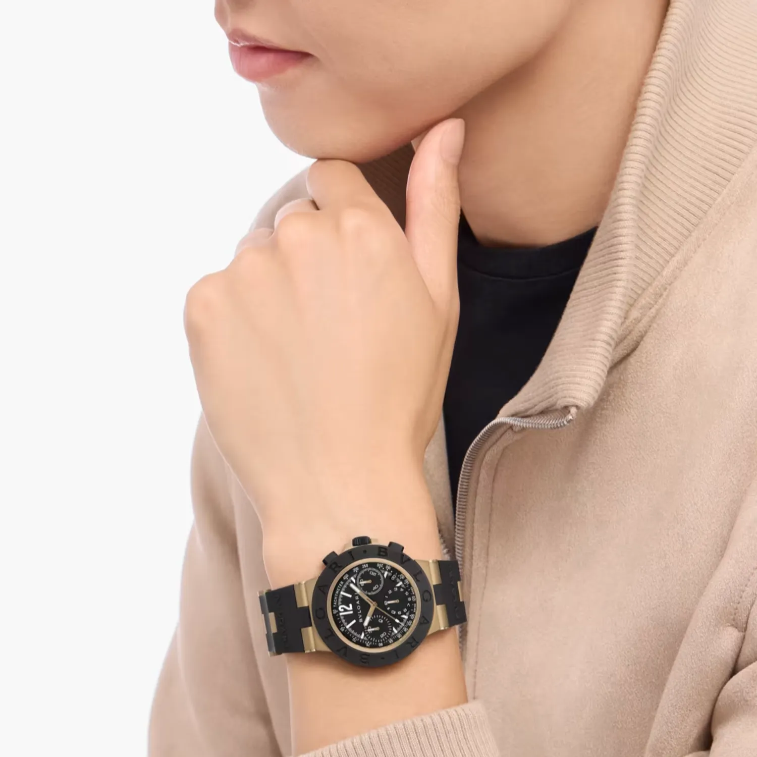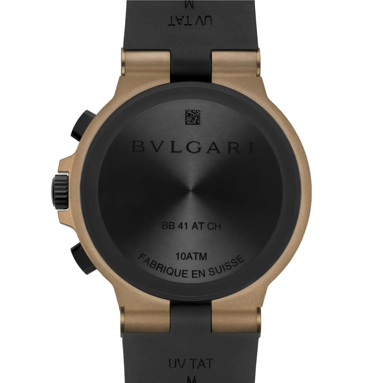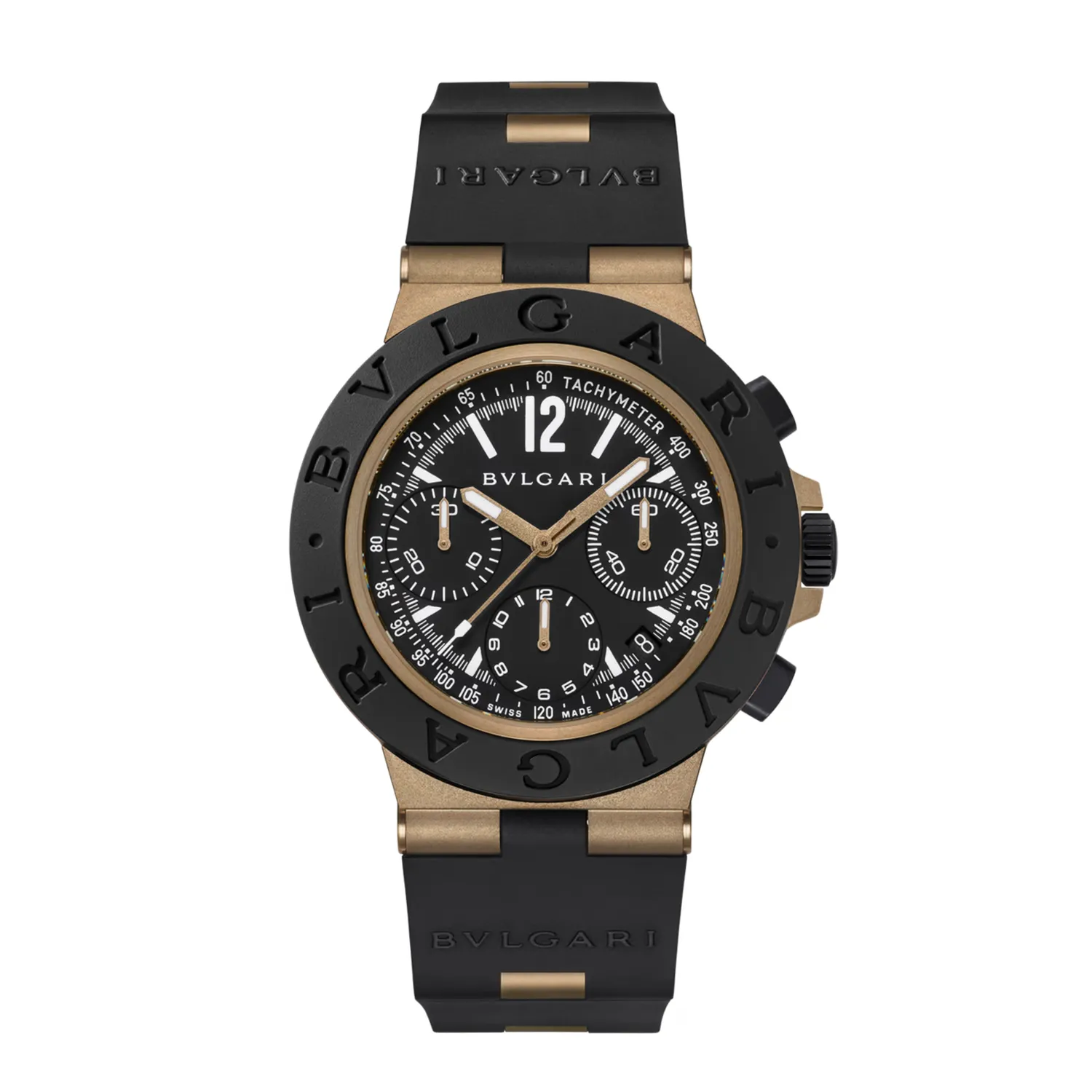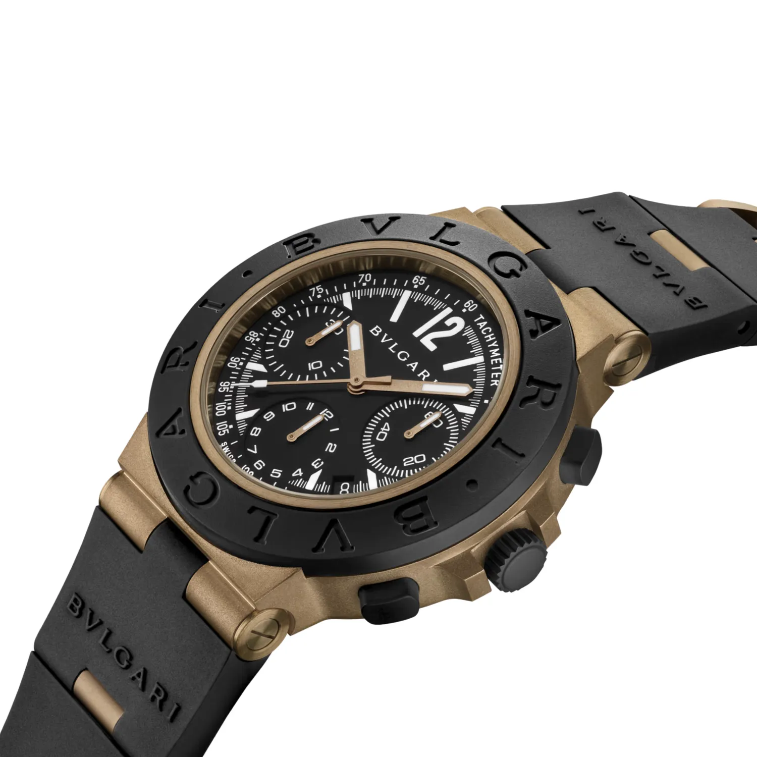 Montre Bvlgari Bronzo Chronograph avec mouvement mécanique de manufacture, remontage automatique, fonctions chronographe, heures, minutes, petite seconde et date, calibre B381 (6,90 mm d’épaisseur), réserve de marche de 42 heures. Boîtier en bronze sablé de 41 mm (12,35 mm d’épaisseur), lunette en caoutchouc noir avec gravure BVLGARI BVLGARI, cadran noir verni mat avec compteurs de chronographe circulaires bleu azur, index blancs, aiguilles des heures et des minutes en laiton plaqué d’or rose sablé revêtues de Super-LumiNova®, aiguille centrale des secondes du chronographe en laiton plaqué d’or rose sablé avec pointe laquée blanche, aiguilles du compteur de chronographe en laiton plaqué d’or rose sablé revêtues de Super-LumiNova®, guichet de date à 4/5 heures, couronne et poussoirs en titane sablé avec revêtement DLC noir, fond de boîtier en titane sablé et satiné avec revêtement DLC noir, bracelet en caoutchouc noir avec maillons en bronze sablé et boucle avec système auto-agrippant. Étanche jusqu’à 100 mètres.