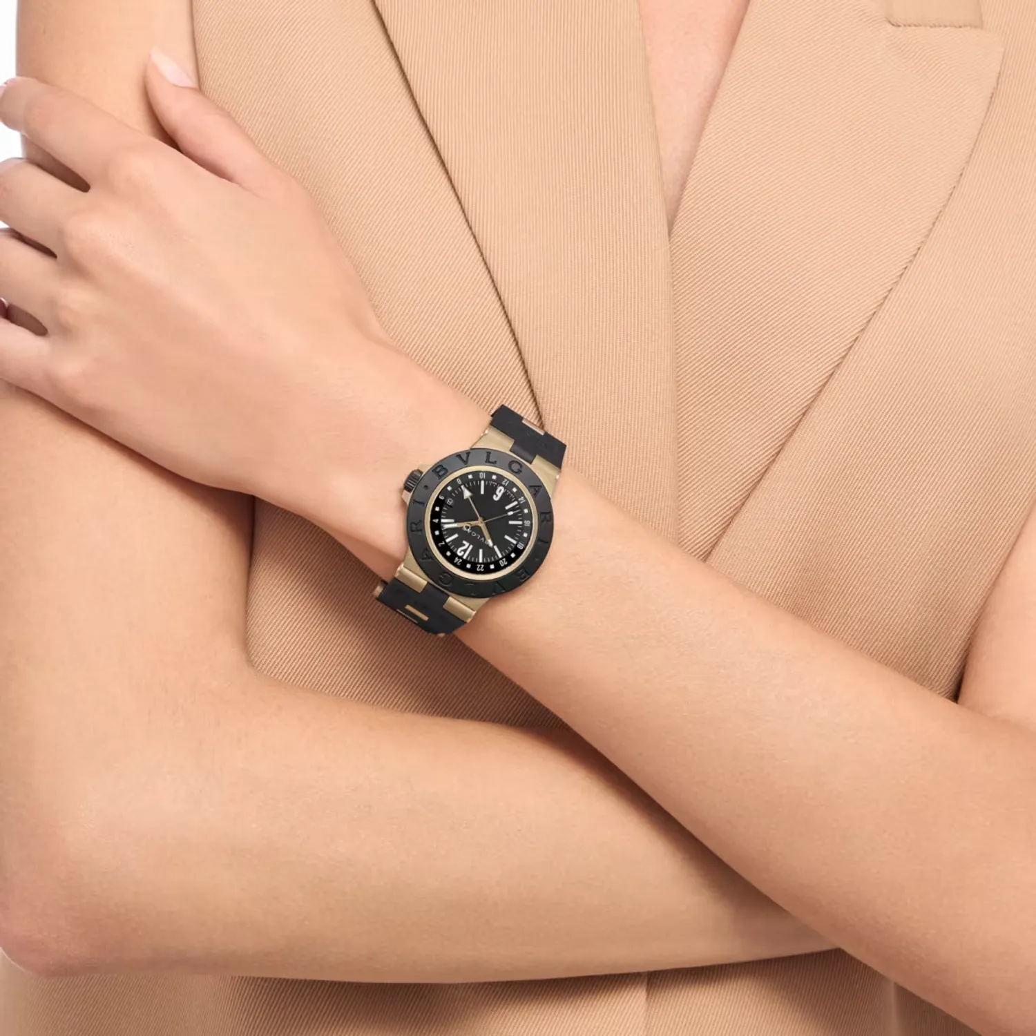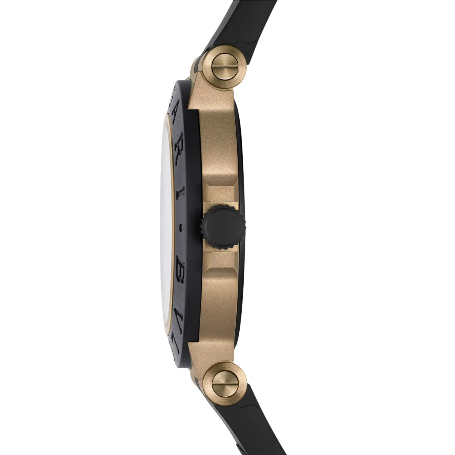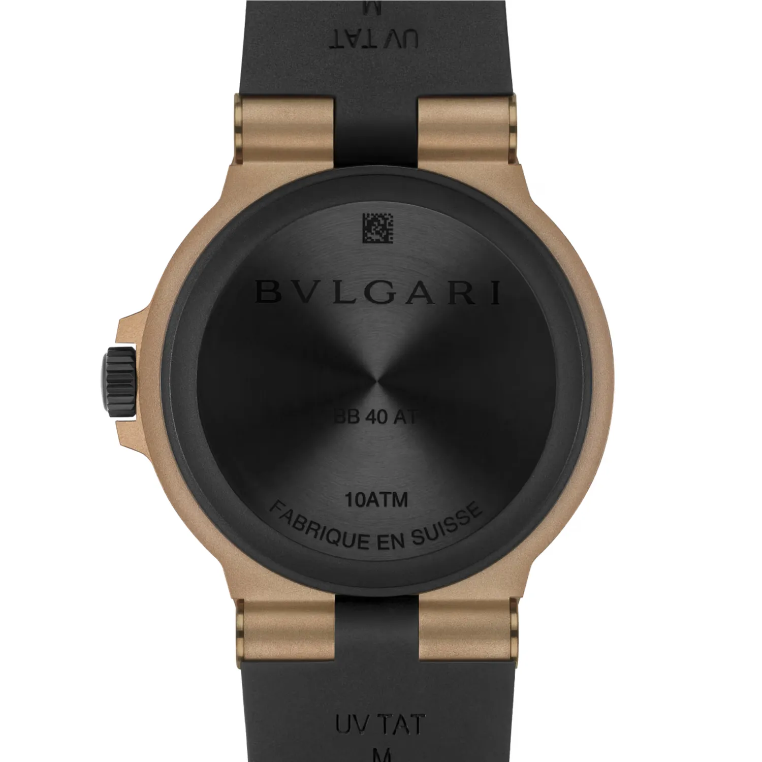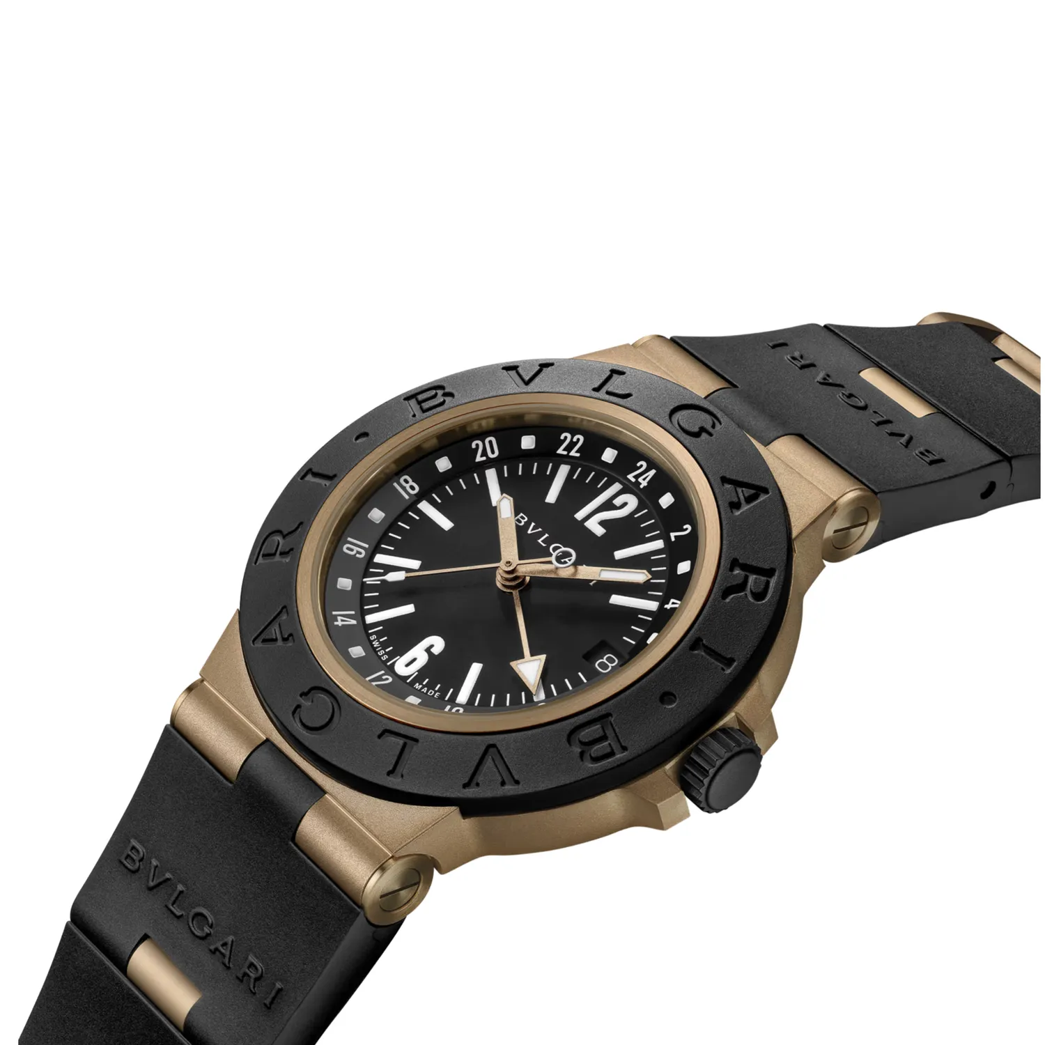 Montre Bvlgari Bronzo GMT avec mouvement mécanique, remontage automatique, fonctions heures, minutes, seconde centrale, date et GMT 24 h, calibre B192 (4,10 mm d’épaisseur), réserve de marche de 50 heures et fréquence de 28 800 A/h (4 Hz). Boîtier en bronze sablé de 40 mm (9.70 mm d’épaisseur), lunette en caoutchouc noir avec gravure BVLGARI BVLGARI, cadran noir verni mat avec indicateur jour-nuit à côté du disque des 24 heures, index blancs, aiguilles des heures et des minutes en laiton plaqué or rose sablé revêtues de Super-LumiNova®, aiguille centrale des secondes en laiton plaqué d’or rose sablé avec pointe laquée blanche, aiguille GMT en laiton plaqué d’or rose sablé revêtue de Super-LumiNova®, guichet de date à 3 heures, couronne en titane sablé avec revêtement DLC noir, fond de boîtier en titane sablé et satiné avec revêtement DLC noir, bracelet en caoutchouc noir avec maillons en bronze sablé et boucle avec système auto-agrippant. Étanche jusqu’à 100 mètres.